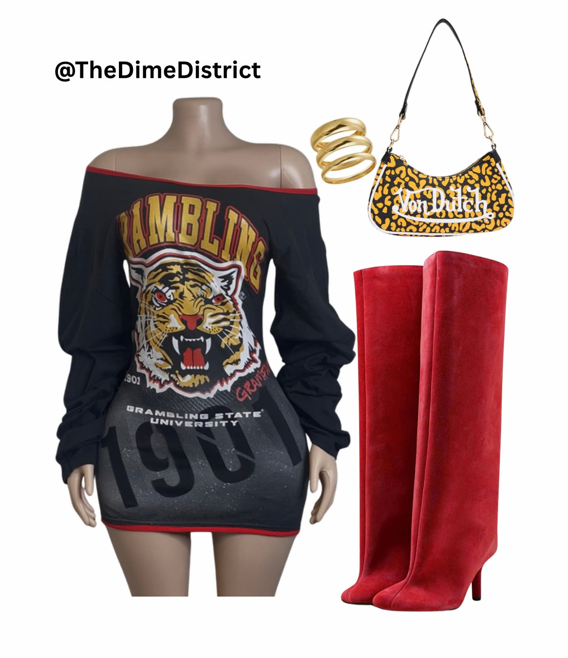 This Original Freestyled piece is a Grambling Baddie’s Favorite. Initially a long sleeve grambling Tshirt created into the perfect spirit piece to represent your beloved school. Also available for other colleges.